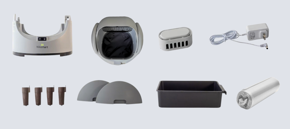 1 roll of disposable waste bags Aroma gel compartment Power adapter (12V) Instruction manual